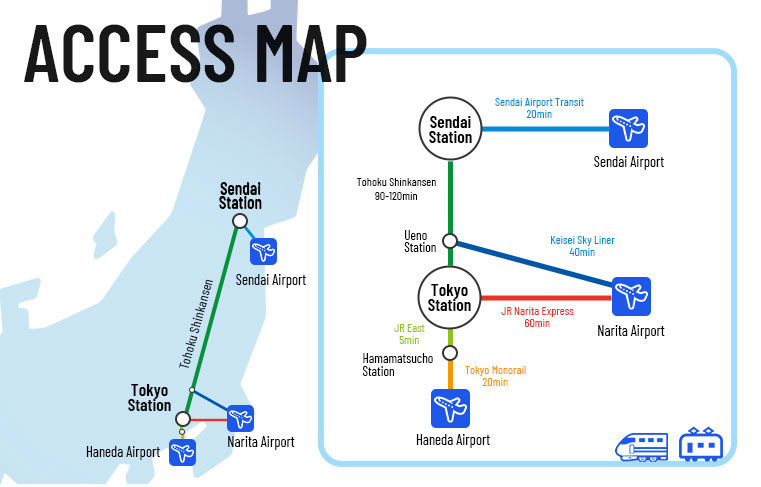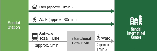 - Taxi: Approximately 10 min from JR Sendai Stn. Taxi Pool (transportation fee \1,300)