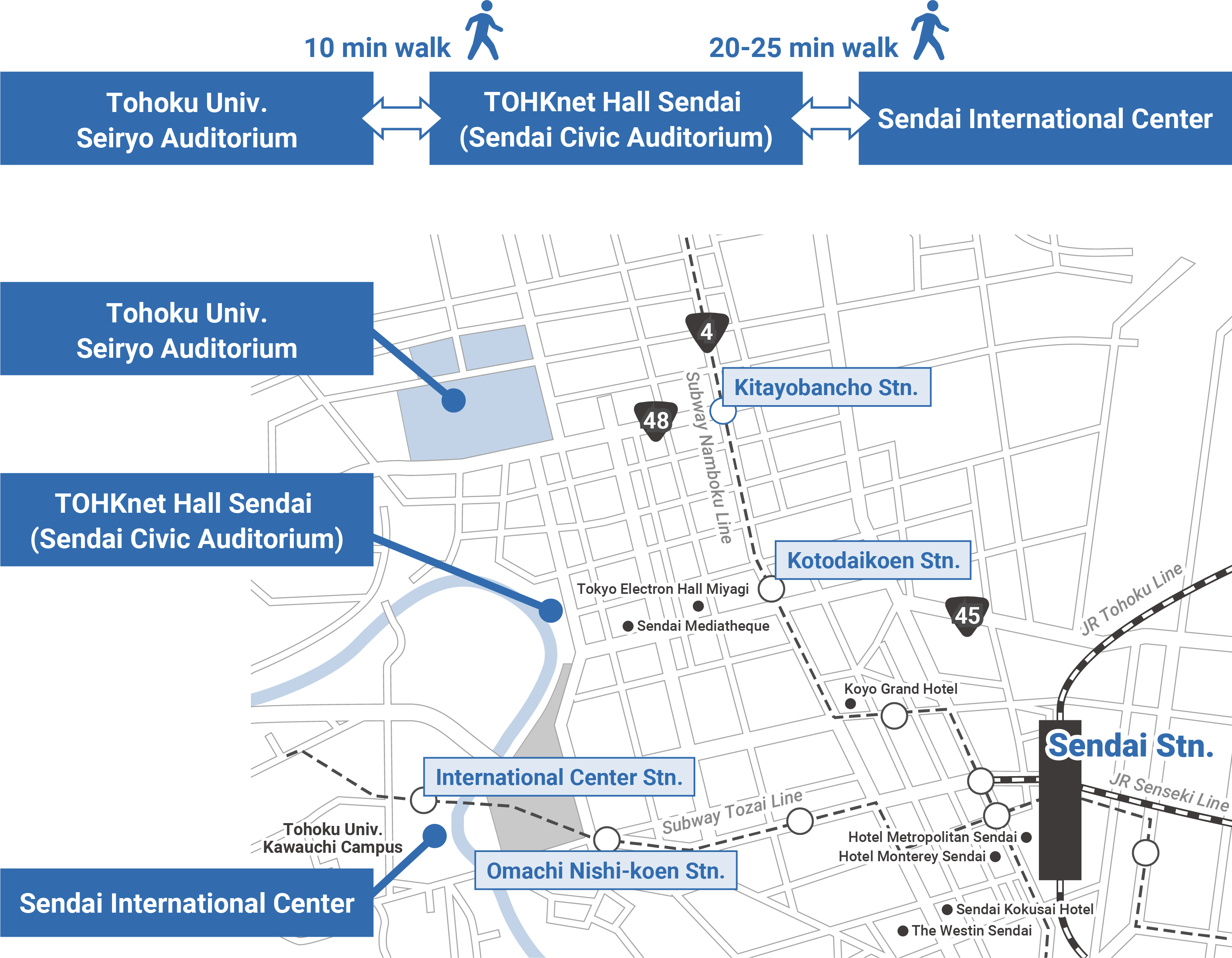 https://www.med.tohoku.ac.jp/english/map/- Subway: Take a subway for "Izumi Chuo" and get off at "Kitayobancho" Stn (About 5 min from Sendai Stn., transportation fee \200) and 15 min walk from "Kitayobancho" Stn., Exit at North 2